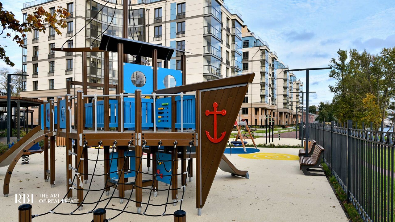 В «Петровской ривьере» все напоминает о водной стихии. Символ дома — раковина наутилуса (морского моллюска). Морская тема нашла отражение и на детской площадке, игровой городок выполнен в виде пиратского корабля.